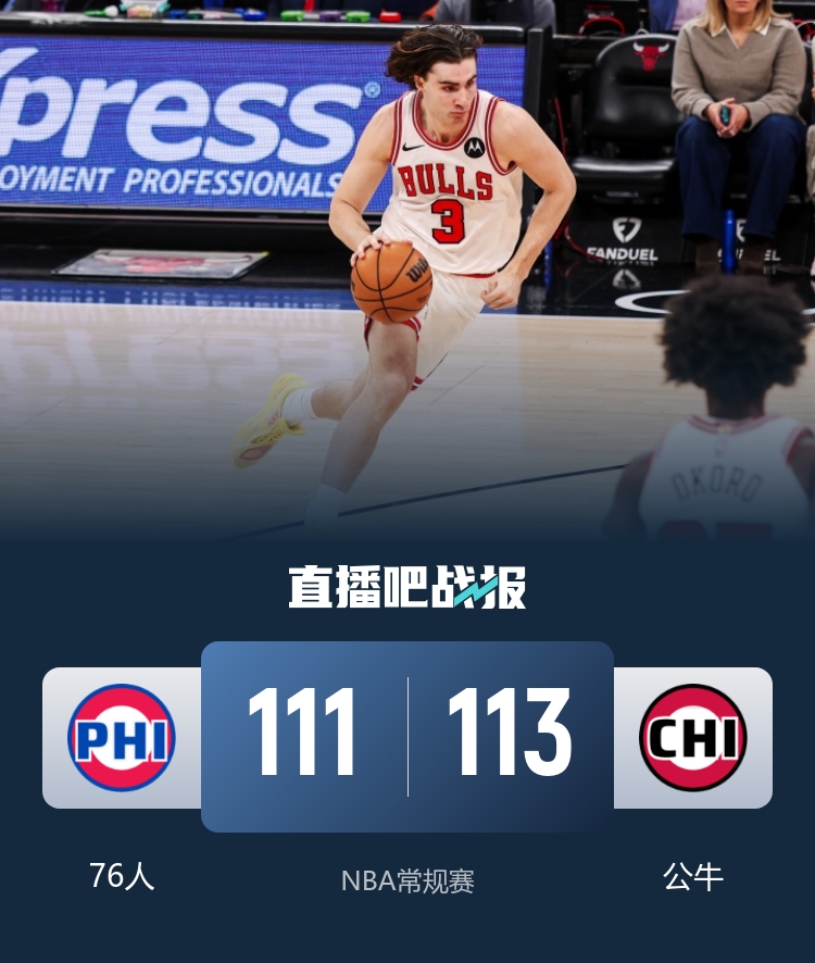 首節對決76人反客為主外線手感熱到發燙,他們單節三分11投8中,單節25投16中爆砍45分并在首節就拿到18分優勢;次節雙方雖然狀態相差不大但首節巨大的分差讓76人完全控制局面,半場馬克西和恩比德合砍40分并幫助76人取得19分領先。休息歸來76人攻勢回落三分手感驟降,他們前10分鐘里僅得16分,公牛追回8分一度縮小至個位數,看到希望后的公牛在第四節一直緊咬比分,76人最后4分鐘里一分未得拱手讓出主動權,武切維奇最后時刻命中三分完成準絕殺。最終,公牛主場最多落后24分的情況下完成翻盤逆轉76人奪得榜首大戰的勝利。