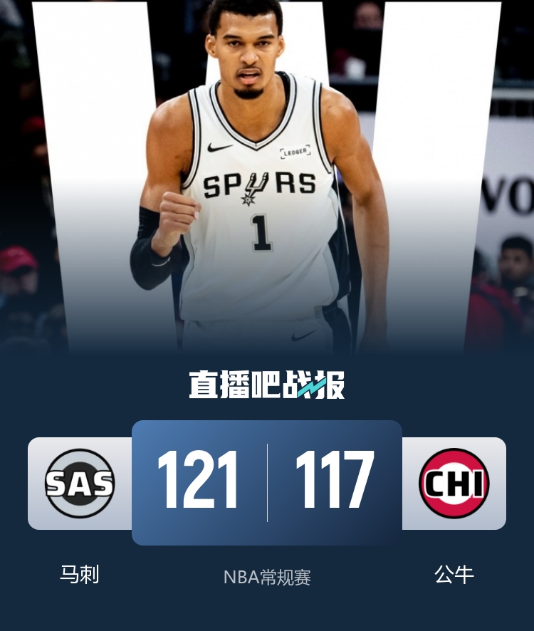 比賽開始,馬刺反客為主打出13-4不錯開局,公牛連續內線追分,但馬刺多點開花回應,文班亞馬直接填滿數據欄,首節馬刺領先8分,次節雙方繼續對攻,福克斯接連突破取分,文班外線也開和,但公牛全員找回手感給出回應,并在半場反超1分。下半場,雙方繼續拉鋸戰,公牛投手們紛紛發力,道蘇姆撐起替補席單節得分近乎上雙,三節公牛領先到9分,末節公牛進攻端受阻,文班亞馬里突外投很快上雙,最后時刻又兩記三分反超比分,許爾特關鍵三分不中,最終馬刺121-117險勝公牛,拿到3連勝同時送對手3連敗。