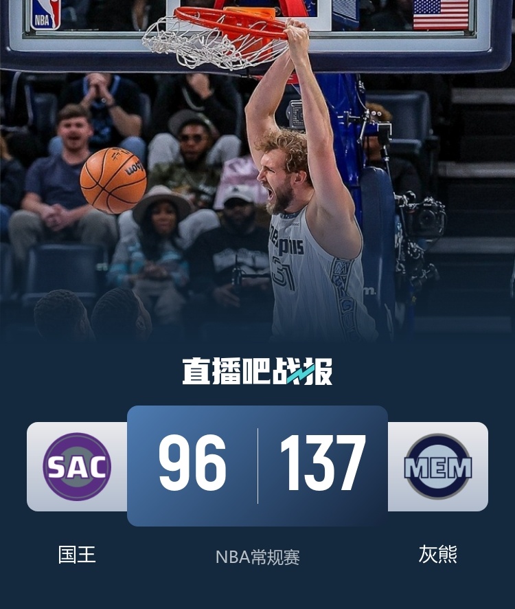 灰熊(5-11):阿爾達馬29分5板3助2帽、蘭代爾21分6板、科沃德19分4板4助、埃迪16分4板2斷、韋爾斯13分1板2助、普羅斯珀11分1板1助、斯潘塞7分2板6助、GG·杰克遜6分9板1助、馬沙克6分2板、威廉姆斯4分5板15助2斷、康查爾3分7板3助2斷、波普2分3板7助