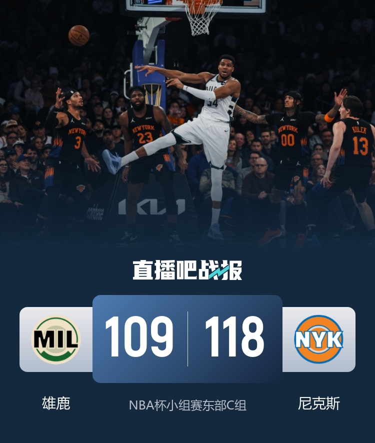 比賽開始,雙方開場短暫相持,字母哥打成2+1引領雄鹿11-2的攻擊波取得領先,AJ·格林連中三分,但尼克斯多點開花,不斷沖擊內線得手,哈特連續打成2+1率隊反超,此后尼克斯再度啞火,雄鹿再轟11-0的攻擊波確立優勢,尼克斯及時回暖連中三分,半場戰罷雄鹿62-61擊敗尼克斯。易邊再戰,布倫森火力全開,單打獨得16分幫助球隊占據場上主動,雄鹿輪番沖擊內線拿分,AJ·格林三分還有,末節庫茲馬連續拿分帶隊追趕,關鍵時刻布倫森連投帶罰拿到6分穩住局勢,雄鹿大勢已去無力回天。最終,雄鹿109-118不敵尼克斯,杯賽出局。