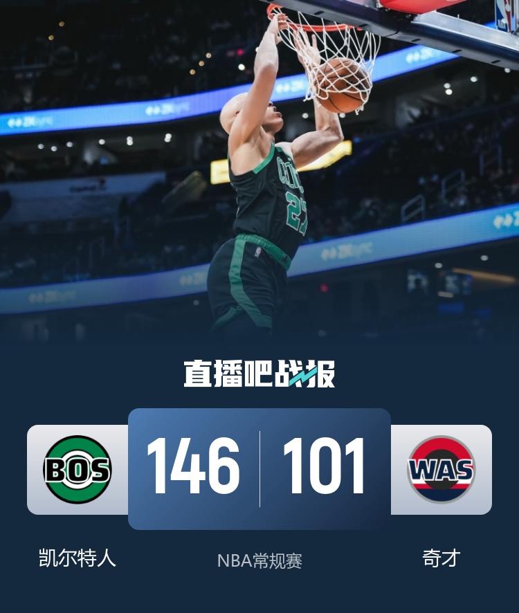 一開場,凱爾特人反客為主打出11-4的開局,奇才不斷沖擊內線連投帶罰努力追趕,凱爾特人連中三分穩(wěn)住局勢,次節(jié)奇才命中率下降,凱爾特人打出17-5擴大領先,此后奇才大舉反擊,尚帕尼劈扣打成2+1,幫助球隊轟出12-0的攻擊波迫近比分,半場戰(zhàn)罷凱爾特人66-59領先奇才。易邊再戰(zhàn),凱爾特人牢牢占據場上主動,懷特和沃爾什聯(lián)手帶隊擴大分差,末節(jié)奇才完全啞火,安芬尼·西蒙的獨中4記三分幫助球隊轟出21-5領先39分,奇才大勢已去無力回天。最終,凱爾特人146-101大勝奇才,客場過關。