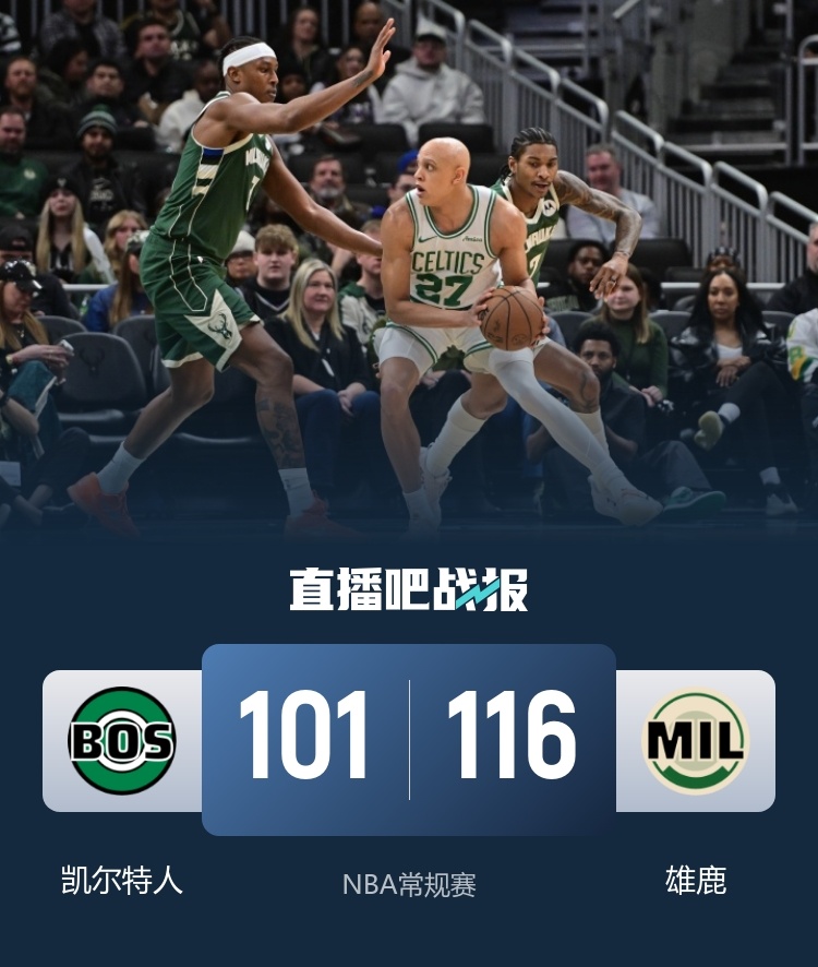 12月12日訊 NBA常規賽,雄鹿主場迎戰凱爾特人。凱爾特人5連勝,以15勝9負排東部第3,雄鹿2連敗,10勝15負排東部第10。