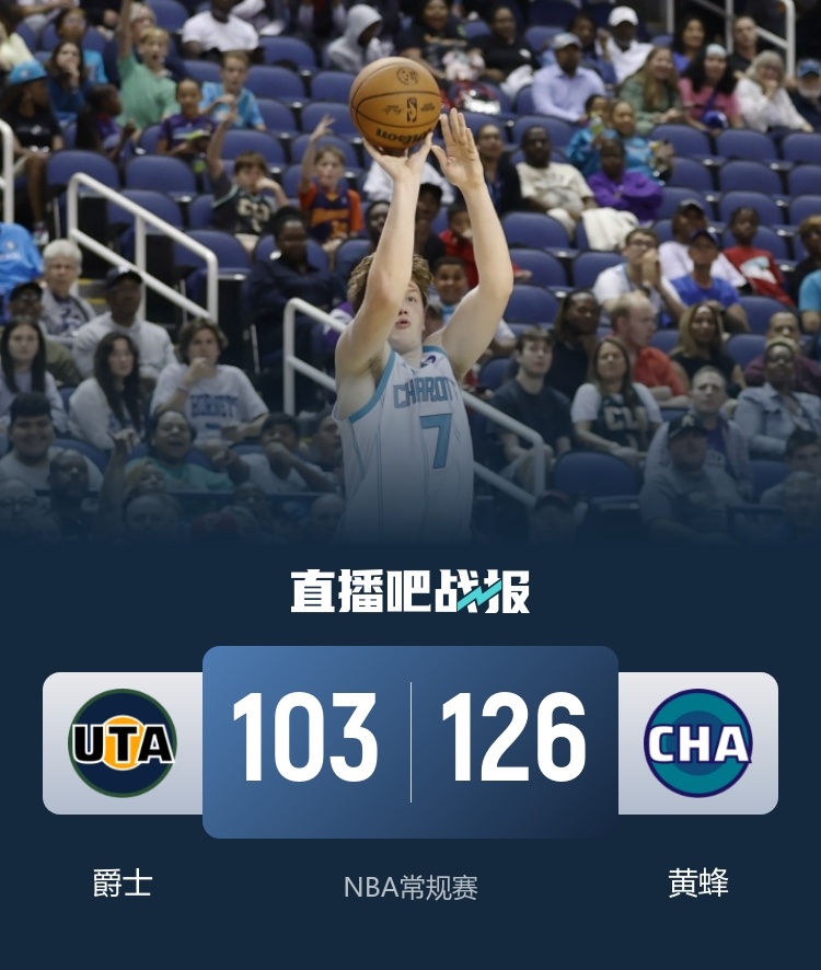 比賽開場,兩隊很快找到進攻狀態,展開對攻戰,比分交替領先,但下半節爵士突然斷電,黃蜂抓住機會建立兩位數領先優勢。次節黃蜂延續外線的火熱手感,很快將分差擴大到20分以上,爵士這邊則由馬爾卡寧苦苦支撐,半場結束黃蜂71-48領先。易邊再戰,爵士進攻端手感回暖,但黃蜂依然牢牢掌握場上主動,分差在20分上下波動,比賽進入末節,黃蜂穩扎穩打維持分差,比賽結果蓋棺論定,最終黃蜂126-103大勝爵士。